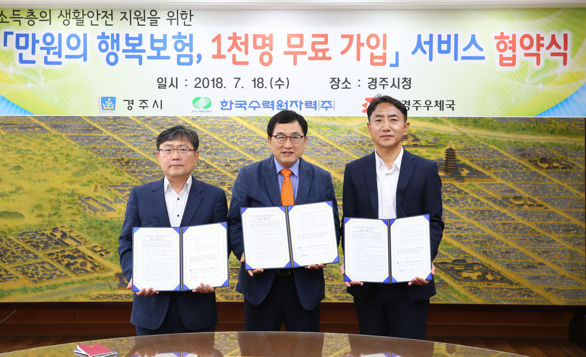시는 18일 대외협력실에서 공공협력을 통한 저소득층의 의료비보장과 지역사회복지실천을 위해 한수원(지역상생협력처장 윤상조), 경주우체국(국장 최정규)과 ‘만원의 행복보험 무료가입 서비스 업무협약’을 체결했다.