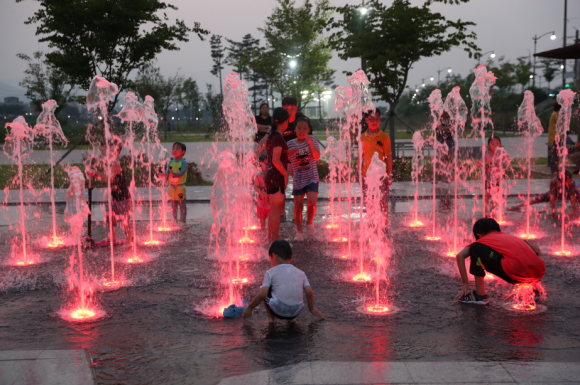 [최병구 기자] 경주시 북천 고향의 강이 조성된 알천교 분수대에서 시민들과 함께 나온 어린이들이 찜통더위의 열대야를 시원하게 즐기고 있다.