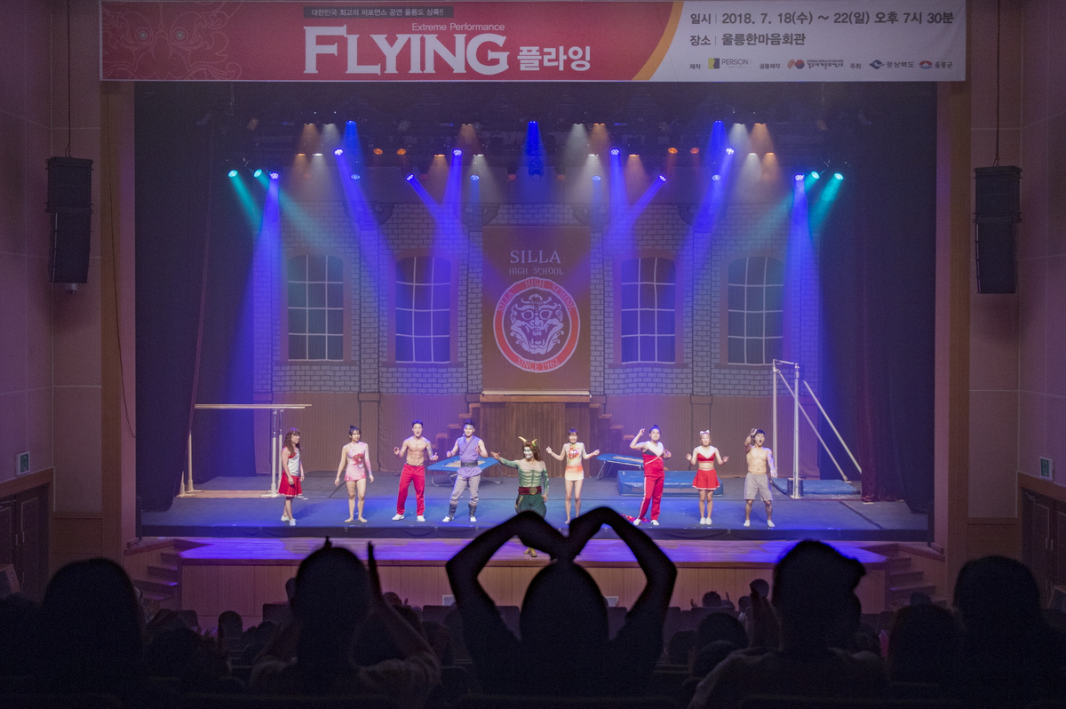 국내외 누적 관람객 77만명을 기록하며 넌버벌 공연의 역사를 써나가고 있는 ‘플라잉(FLYing)이 울릉도 첫 공연에서 뜨거운 반응을 얻었다. 지난 18일 오후 7시30분 울릉군 한마음회관은 울릉군민 뿐 아니라 공연을 즐기기 위한 관광객들로 꽉 들어찼다.