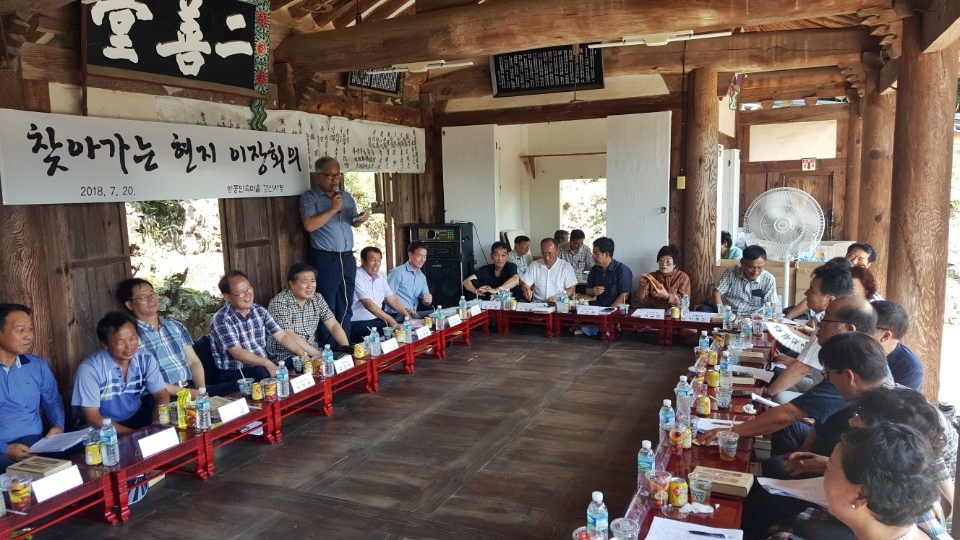 강동면은 주민과 소통하는 행정실현을 위해 지역 명소, 주요사업 추진현장 등 주민의 생활 현장을 순회하면서 이장회의를 열고 있다.