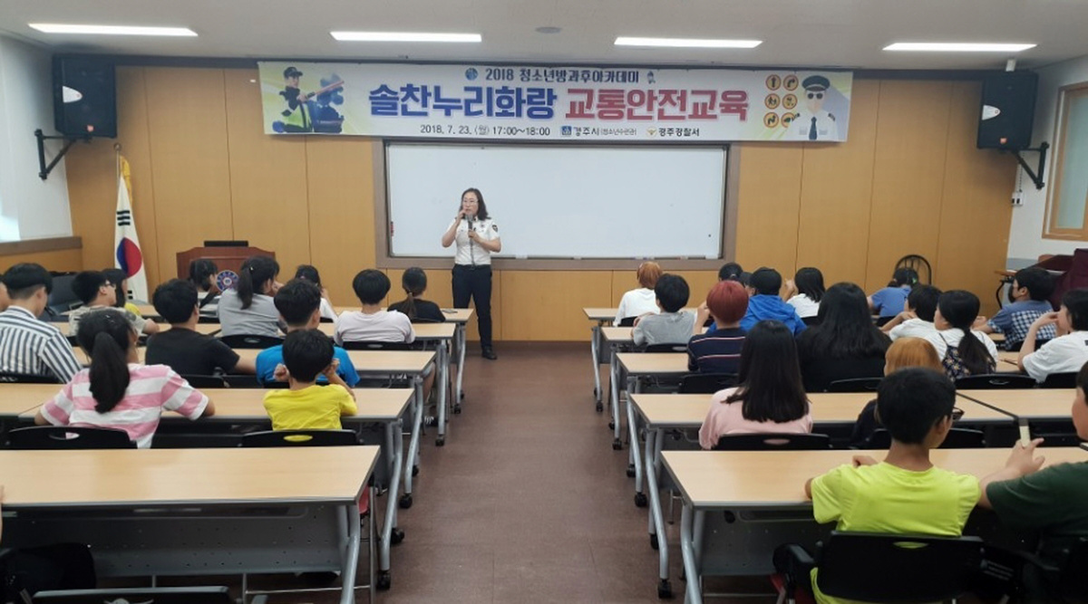 이날 경주경찰서 경비교통과 이종희 경장이 강사로 나서, 청소년이 알아야 할 교통 법규와 안전한 보행습관, 안전한 자전거 운전 등에 대한 교육이 진행됐다.