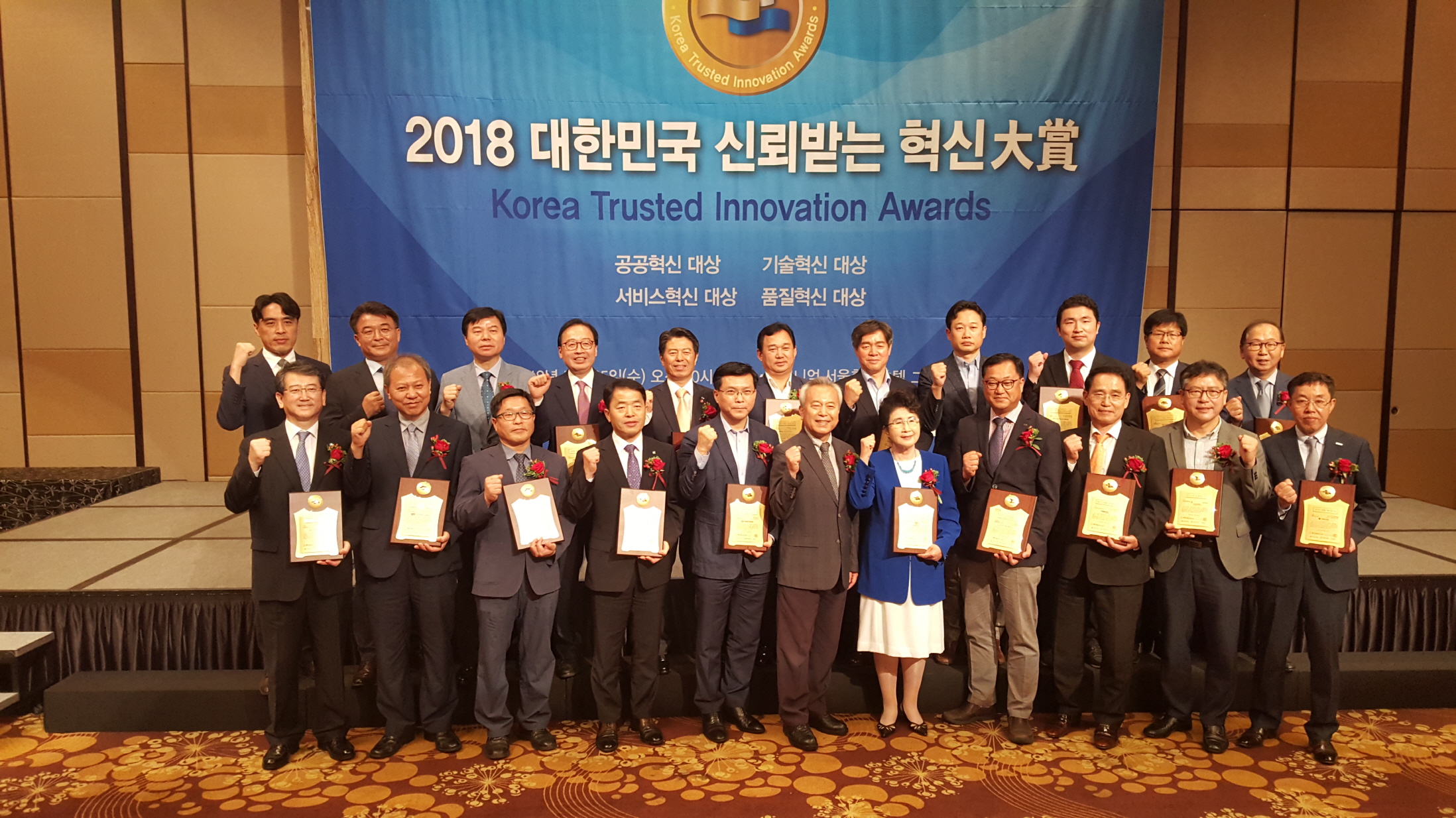 | ↑↑ 대한민국 신뢰받는 혁신대상 수상자들이 기념사진을 찍고 있다 (두번째줄 오른쪽에서 네번째 이두환 (재)문화엑스포 사무처장) |