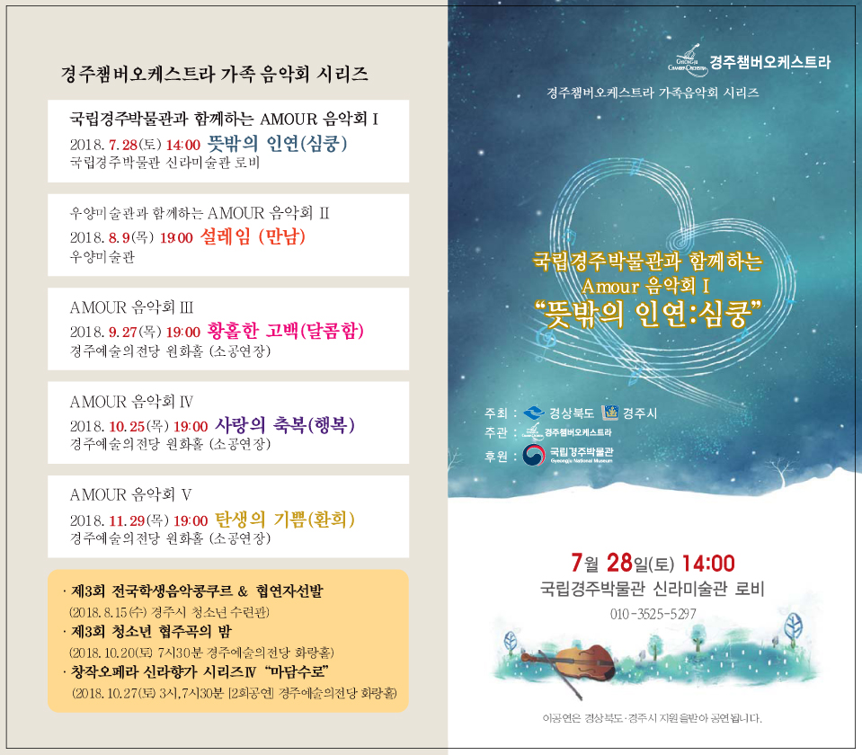 이번 음악회는 “뜻밖의 인연(심쿵)”이라는 주제로 그 동안 지역사회에서 꾸준한 활동을 하고 있는“경주챔버오케스트라”의 가족음악회 시리즈 총 5회 중 첫 번째 공연이다.