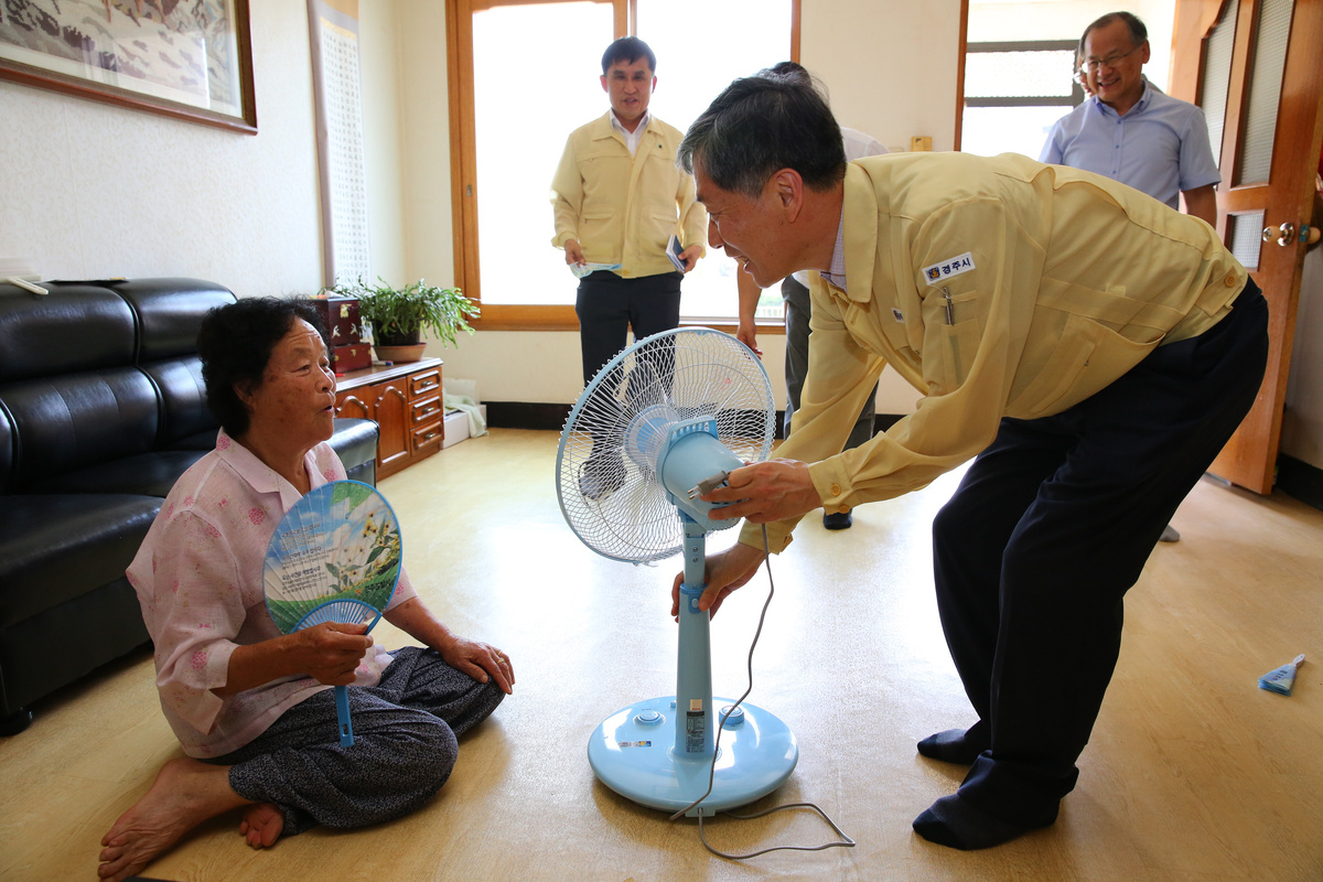 이어 폭염대비 독거노인 보호대책 추진상황 점검을 위해 선도동에 거주하는 무의탁 독거노인 가구를 찾은 강 부시장은 폭염속 어르신의 불편사항을 살피고, 건강하게 여름을 지낼 수 있도록 경주시사회복지협의회에서 지원받은 선풍기를 전달했다.