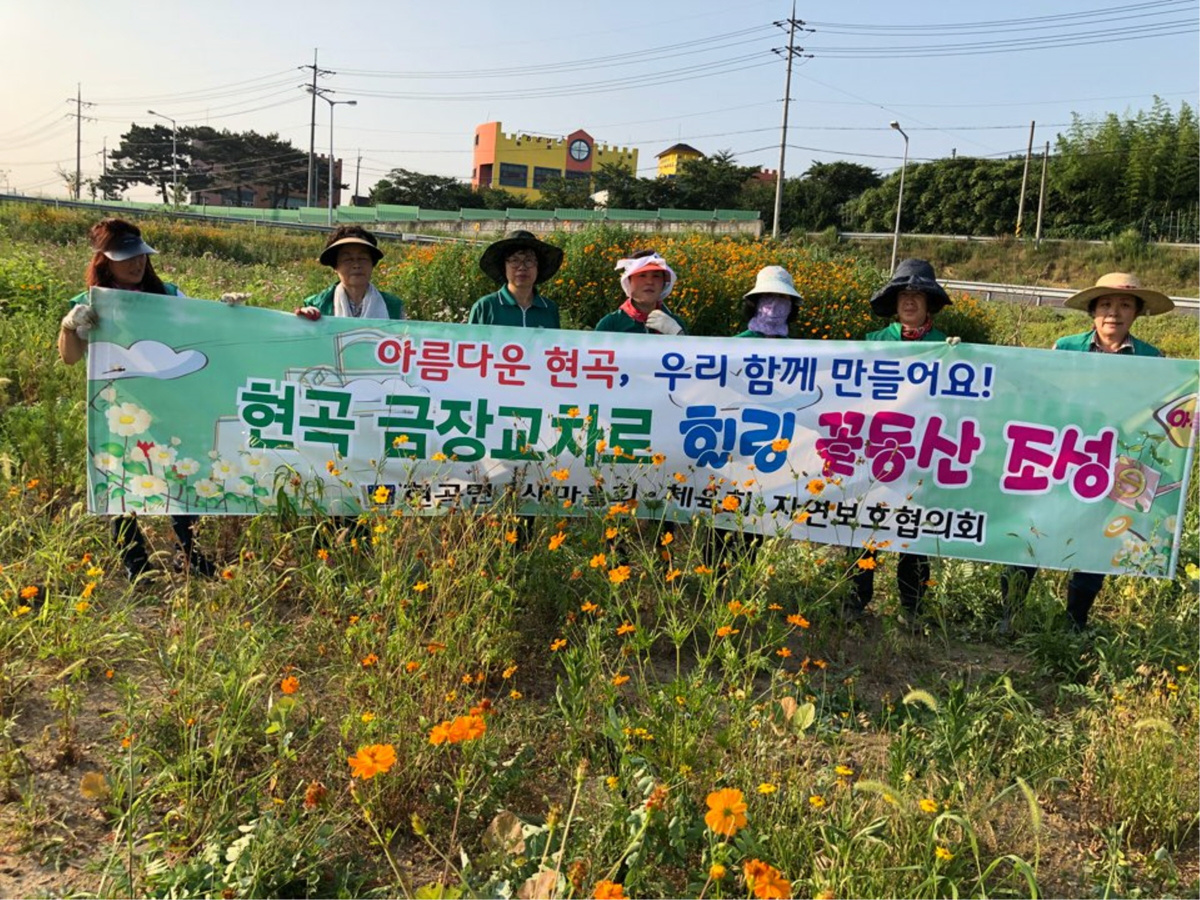 현곡면(면장 박순갑)에서는 지난 3월부터 특수시책으로 영천과, 건천. 안강 방면주요 진출입 관문인 금장교차로 주변 유휴지 2만여㎡에 우거진 잡목과 수풀로을 제거하고 황화코스모스를 비롯해 이팝나무, 회양목을 식재해 힐링 꽃동산으로 조성하고 있다.