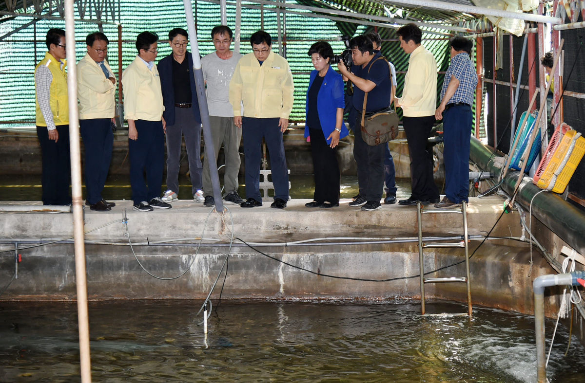 특히 육상양식장에 대해서는 저층해수취수시설 점검, 적정 사육량 확인, 산소공급기 및 액화산소 확보 여부, 여과기와 순환펌프 설치 등을 지도하고, 해상가두리에는 고수온 및 적조 발생 시 수층 조절 가능 여부와 양식물 안전해역 이동가능 여부를 중점적으로 점검했다.
