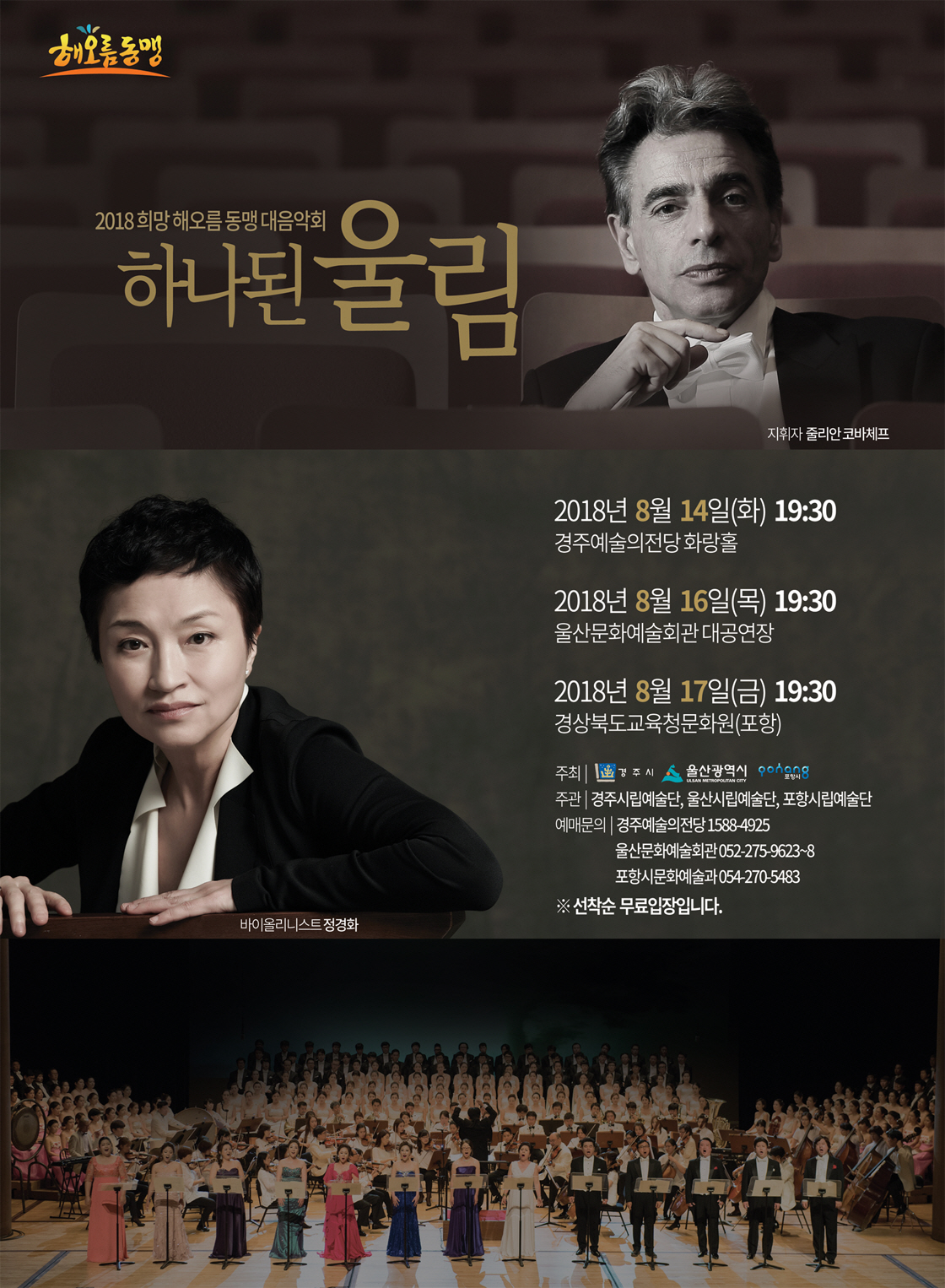 ‘하나된 울림’이란 타이틀로 80인조 해오름 연합 오케스트라와 세 도시의 시립합창단 150여 명이 함께 무대에 오른다.