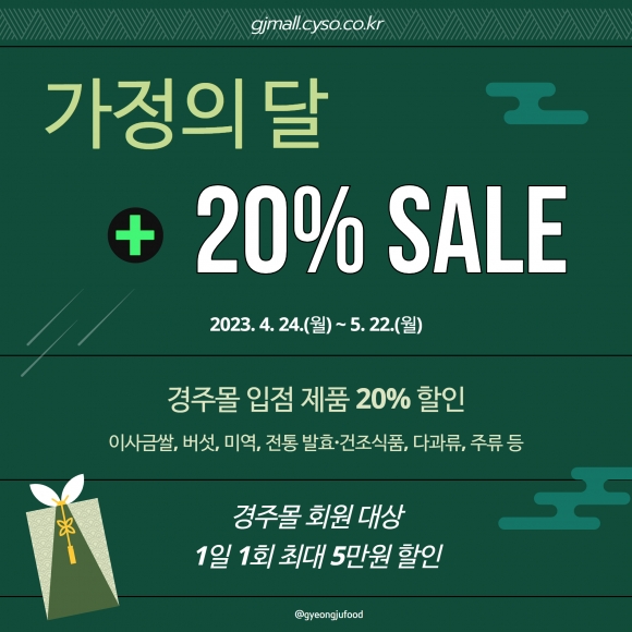 경주시가 5월 가정의 달을 맞아 경주 (gjmall.cyso.co.kr) 사이트에서 오는 22일까지 전 품목 20% 할인행사를 펼친다고 10일 밝혔다.