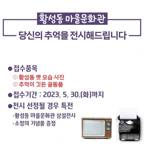 최진열 황성동장은 “유적과 유물 위주의 역사뿐만 아니라 개인의 삶 또한 우리 삶터를 지켜온 소중한 기록이다”며 “서랍이나 창고에 넣어둔 오래된 사진과 생활 골동품들을 꺼내 시민들과 함께 황성동의 역사를 공유해주길 바란다”고 적극적인 기증을 당부했다.