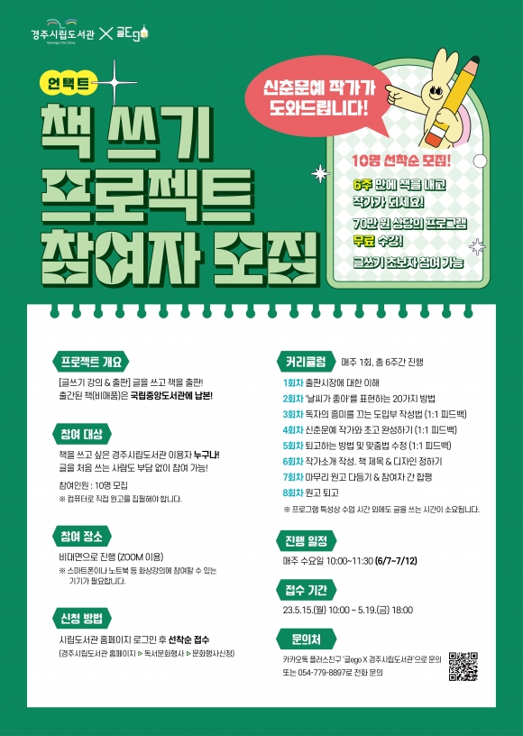 [오마이경주/경주시민신문=김경미기자] 경주시립도서관이 작가가 될 수 있는 ‘책 쓰기 프로젝트’를 다음달 7일부터 7월 12일까지 매주 수요일마다 운영한다고 11일 밝혔다.