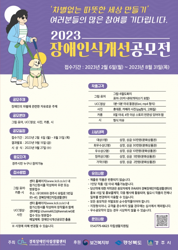 [오마이경주/경주시민신문=김경미기자] 경북장애인자립생활센터(센터장 박귀룡)에서는 권익옹호사업의 일환으로 2023장애인식개선공모전을 실시한다.