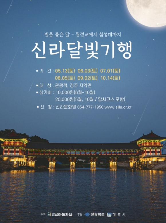 올해는 그간 진행된 행사와는 달리 달빛기행에 앞서 오후 1시 30분부터 무열왕릉과 서악동고분군, 불국사를 방문해 문화재 답사는 물론 음악회 감상과 사물소리명상 등을 추가하는 특별 이벤트도 5‧10월 펼쳐진다.