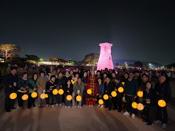 | ↑↑ 지난 13일 참가자들이 백등을 손에 들고 신라달빛기행 중 첨성대 앞에서 기념촬영을 하고 있다. |