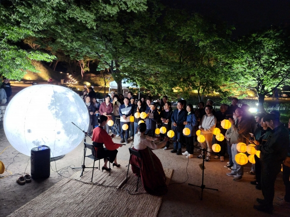 | ↑↑ 지난 13일 참가자들이 신라달빛기행 트레킹 중 지역 예술인들의 국악 공연을 감상하고 있다. |