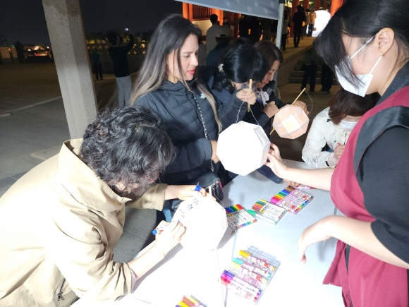 | ↑↑ 지난 13일 월정교 안내부스에서 참가자들이 백등을 배부 받아 소원을 작성하고 있다. |