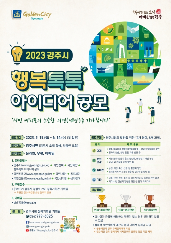 [오마이경주/경주시민신=김경미기자] 경주시가 시민들의 창의적인 아이디어를 시정 발전에 접목하고자 ‘2023 경주시 행복톡톡 아이디어 공모전’을 진행한다고 14일 밝혔다.