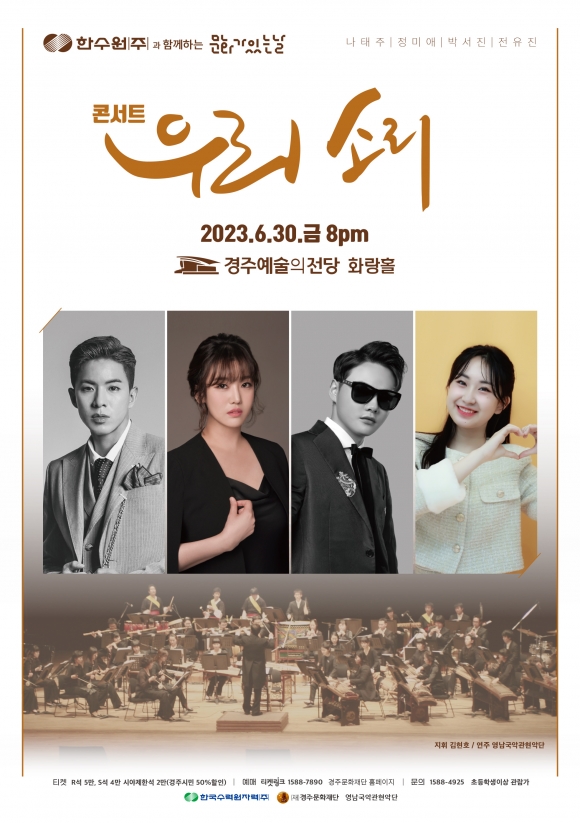 [오마이경주/경주시민신문=김경미기자] 한국수력원자력(주)과 (재)경주문화재단이 주최, 주관하는 ‘한수원과 함께하는 문화가 있는 날’ 6월 공연으로 ‘콘서트 우리소리’가 다음달 30일(금) 오후 8시에 경주예술의전당 화랑홀에서 열린다.
