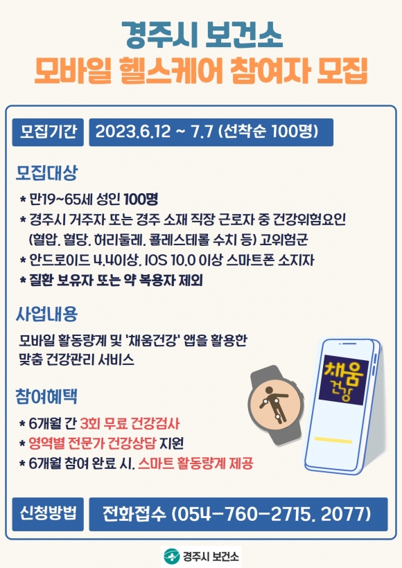 [오마이경주/경주시민신문=김경미기자] 경주시가 지역 주민 자가 건강관리 능력 향상을 위해 ‘보건소 모바일 헬스케어 사업’을 추진한다고 12일 밝혔다.