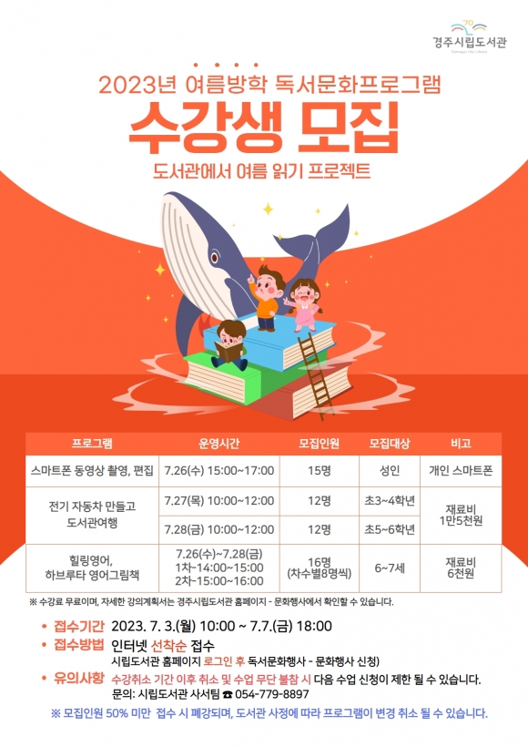 [오마이경주/경주시민신문=김경미기자] 경주시립도서관은 시민들의 독서문화를 진흥하기 위해 ‘2023년 여름방학 독서문화프로그램’을 운영한다.