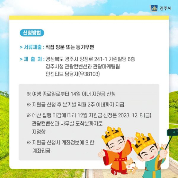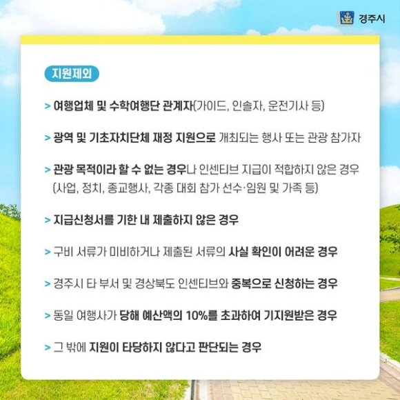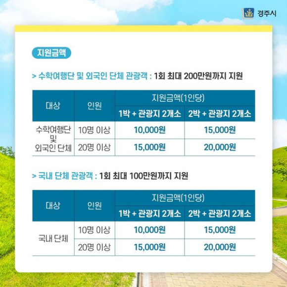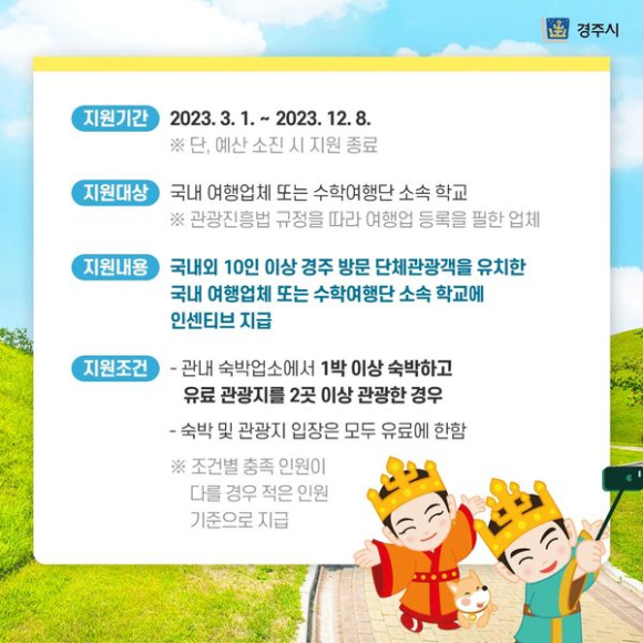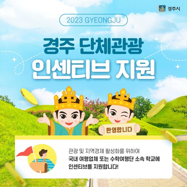 - 국내외 10인 이상 경주 방문 단테관광객을 유피한 국내 여행업체 또는 수학여행단 소속 학교에 인센티브 지급