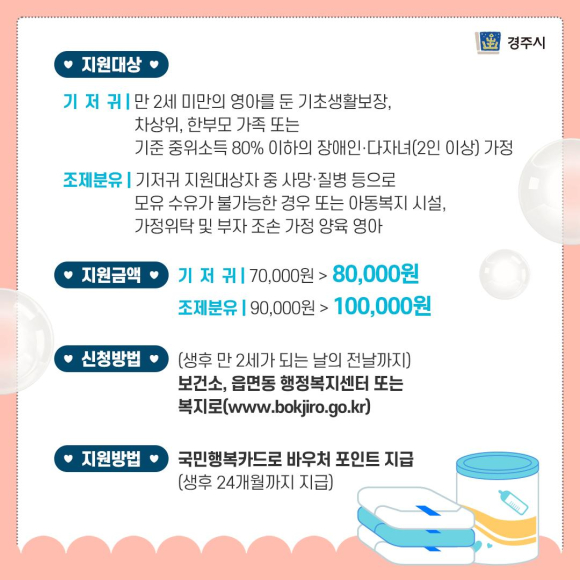 저소득층의 육아 부담을 덜기 위해 지원금액 1만원씩 지원 확대되었습니다! (※ 생후 만 2세가 되는 날의 전날까지)