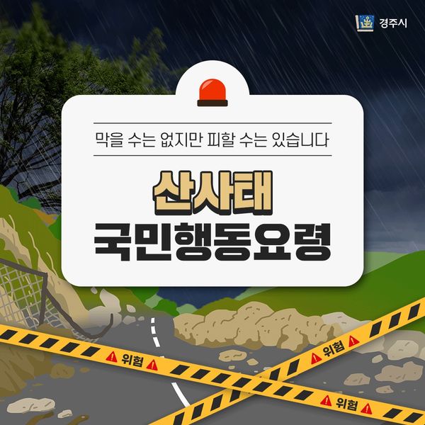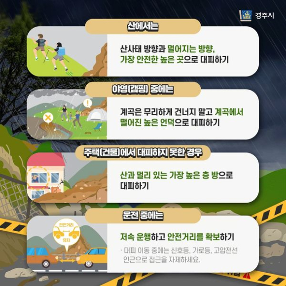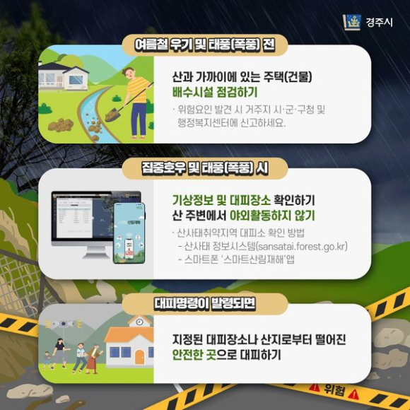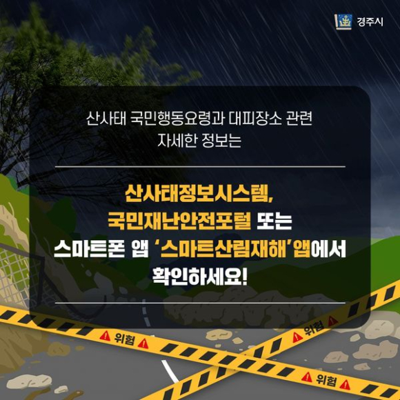 <산사태 국민행동요령>알고 대비하세요! 산사태 국민행동요령과 대피장소 관련 자세한 정보는 (산사태정보시스템, 국민재난안전포털, 스마트폰 앱 ‘스마트산림재해’)에서 확인할 수 있습니다!