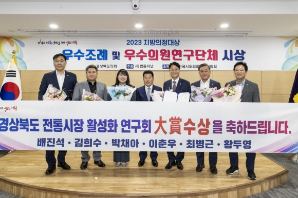 이날 법률저널이 주최하고 대한민국시도의회의장협의회가 후원한 '2023 지방의정대상' 우수의원연구단체 시상식에서 배진석(국민의힘, 경주1)의원이 대표로 활동한 '경상북도의회 전통시장활성화연구회'가 열정적인 의원연구단체 활동으로 지방자치발전과 지역주민의 삶의 질을 향상에 적극 기여한 공로로 대상을 수상하는 쾌거를 거뒀다.