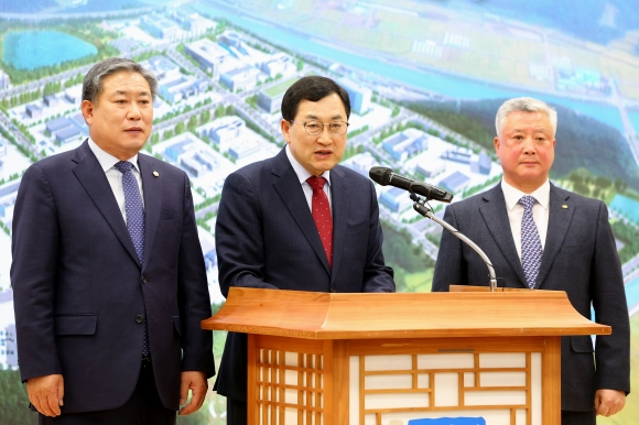| ↑↑ 주낙영 경주시장(가운데) 지난 3.15일 국토부로부터 경주 SMR국가산단 유치 소감과 향후계획을 발표하고 있다. |