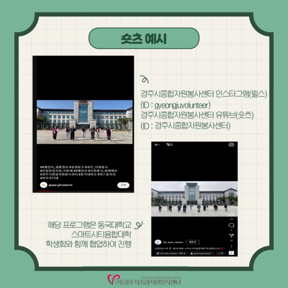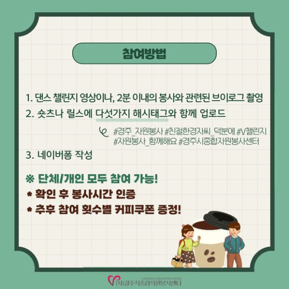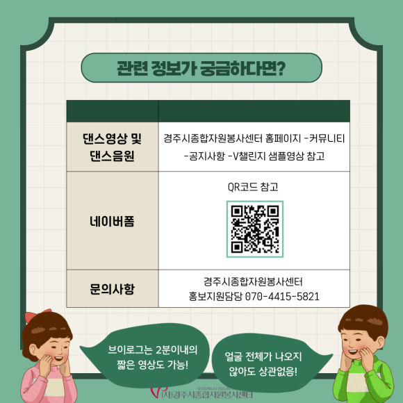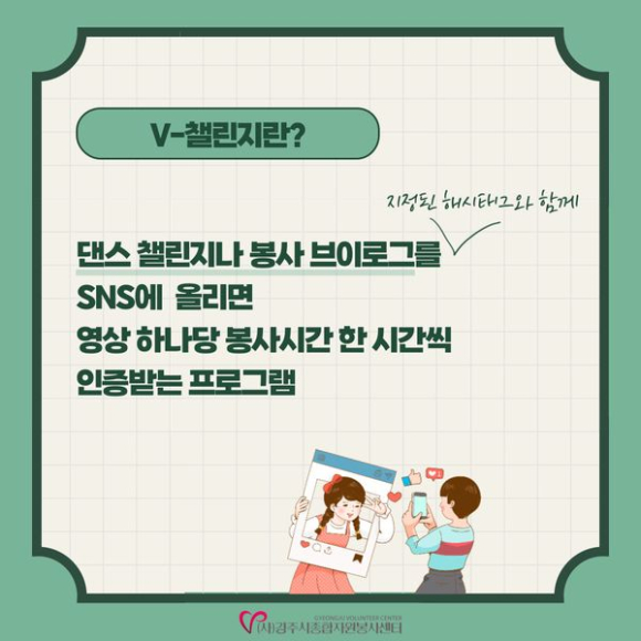 V-챌린지란? 댄스 챌린지나 봉사 브이로그를 '지정된 해시태그와 함께' SNS에 올리면 영상 하나당 봉사시간 한 시간씩을 인증받는 프로그램!