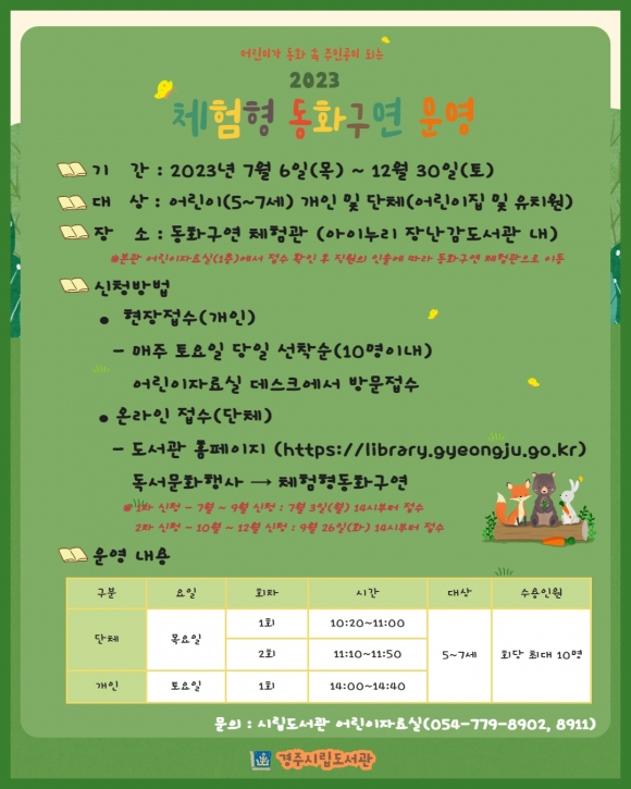 보다 자세한 사항은 경주시립도서관 홈페이지(library.gyeongju.go.kr)를 참고하거나, 시립도서관 본관 어린이자료실(054-779-8902, 8911)으로 문의하면 된다.