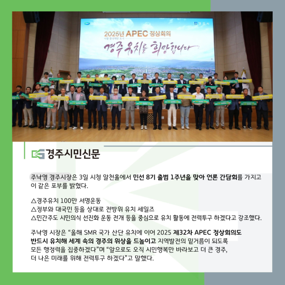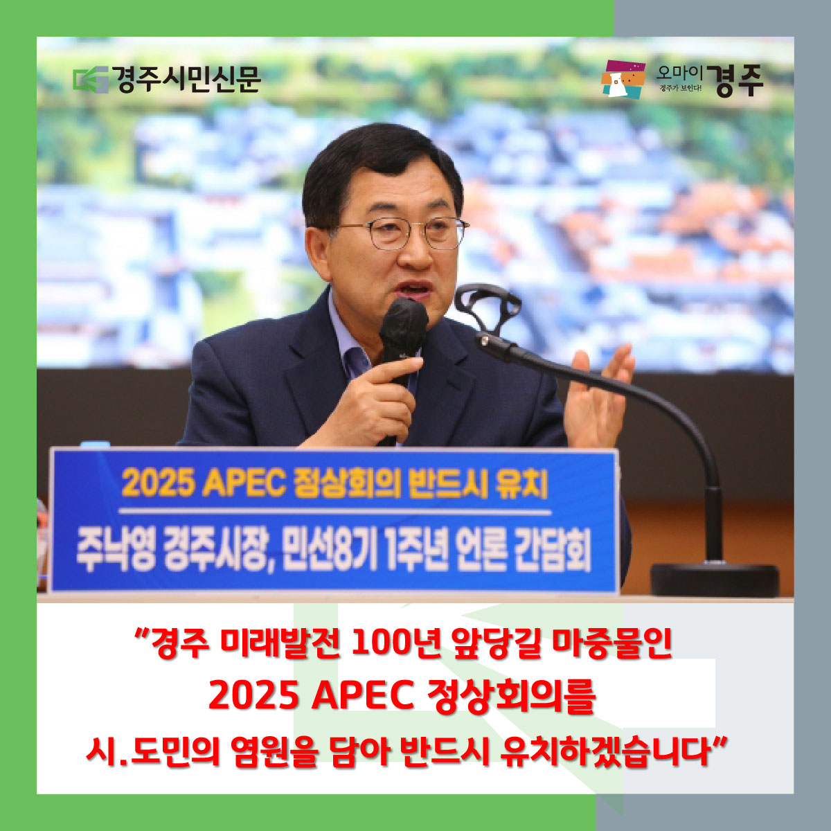 주낙영 경주시장은 “경주 미래발전 100년 앞당길 마중물인 2025 APEC 정상회의를 시.도민의 염원을 담아 반드시 유치하겠습니다”고 약속했다.