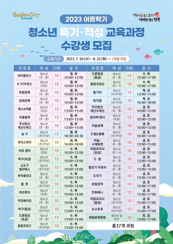 배경혜 경주시 아동청소년과장은 “지역 청소년들이 특기적성 교육으로 알찬 여름방학을 보내길 바란다”며 “앞으로도 청소년의 창의력 향상 및 자기개발 역량 강화에 도움이 되는 다양한 프로그램 운영을 위해 노력하겠다”고 밝혔다.
