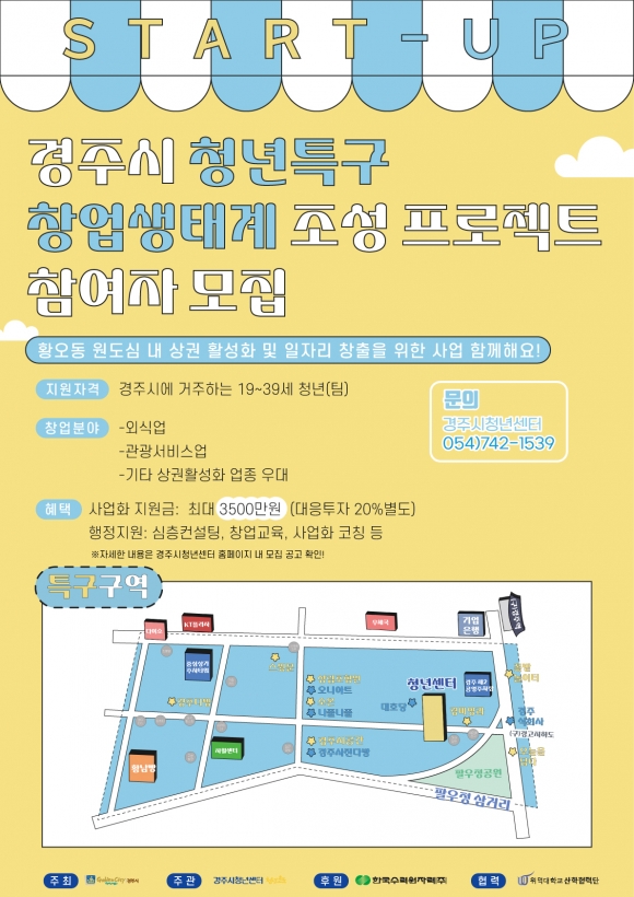 주낙영 경주시장은 “열정과 전문성을 가진 지역의 청년들이 많이 참여하여 침체된 원도심을 활성화하고, 경주시의 황리단길에 이어 새로운 창업 핫플레이스로 거듭나길 바란다”고 밝혔다.