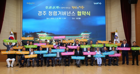 시를 비롯한 경주경찰서, 경주세무서, 한국수력원자력㈜ 상생협력처 등 지역 주요 기관단체 40여 곳*은 6일 시청 알천홀에서 ‘경주 청렴거버넌스 구축 협약식’을 가졌다.