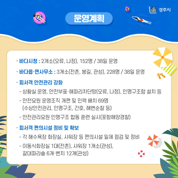 - 운영장소 : 4개소(오류, 나정, 봉길, 관성) ※ 전촌해수욕장 미개장