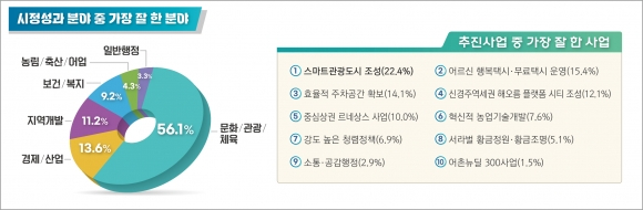 또 지난 1년간 추진한 정책 중 ‘가장 잘한 사업’을 묻는 질문에는 △스마트관광도시 조성(22.4%) △어르신 행복택시. 무료택시 운영(15.4%) △효율적 주차공간 확보(14.1%)를 선택했고,
