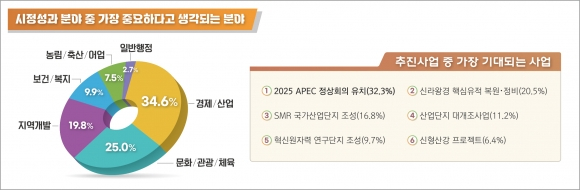 ‘가장 기대되는 사업’을 묻는 질문에는 △2025 APEC 정상회의 유치(32.3%) △신라왕경 핵심유적 복원‧정비(20.5%) △SMR 국가산업단지 조성(16.8%) △산업단지 대개조사업(11.2%) △혁신원자력 연구단지 조성(9.7%) △신형산강 프로젝트(6.4%) 순으로 답했다.