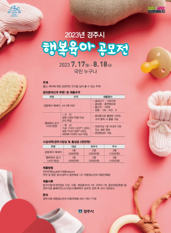 주낙영 시장은 “출생에서 양육까지 빈틈없는 저출산 대응정책과 온가족이 행복한 경주를 만들기 위해 전력을 다하고 있다”며 “이번 공모전을 통해 세상에서 가장 아름다운 육아 이야기로 양육의 가치를 더욱 새롭게 느끼는 계기가 되길 바란다”고 말했다.