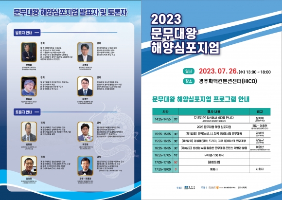 이어 문무대왕 해양 심포지엄에는 윤학배 한국해양대학교 석좌교수의 기조강연 ‘문무대왕의 해양유산 탐험’을 시작으로 문학에서의 문무대왕, 영상 속 문무대왕을 주제로 발표를 진행하며, 그리고 생성 AI를 활용한 문무대왕 콘텐츠 개발과 활용에 대한 주제발표가 이어진다.