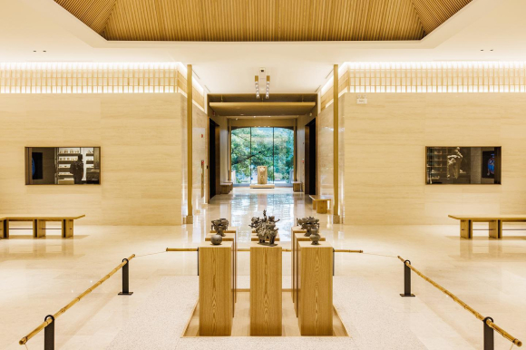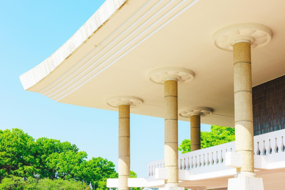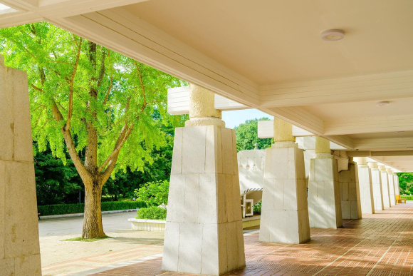 신라역사관은 1975년 건축가 이희태(1925~1981)의 설계로 지어졌습니다. 외부에 기둥들을 일정한 간격으로 세운 정방형의 누각 형태는 경복궁 경회루에서 영향을 받은 것으로 여겨집니다.