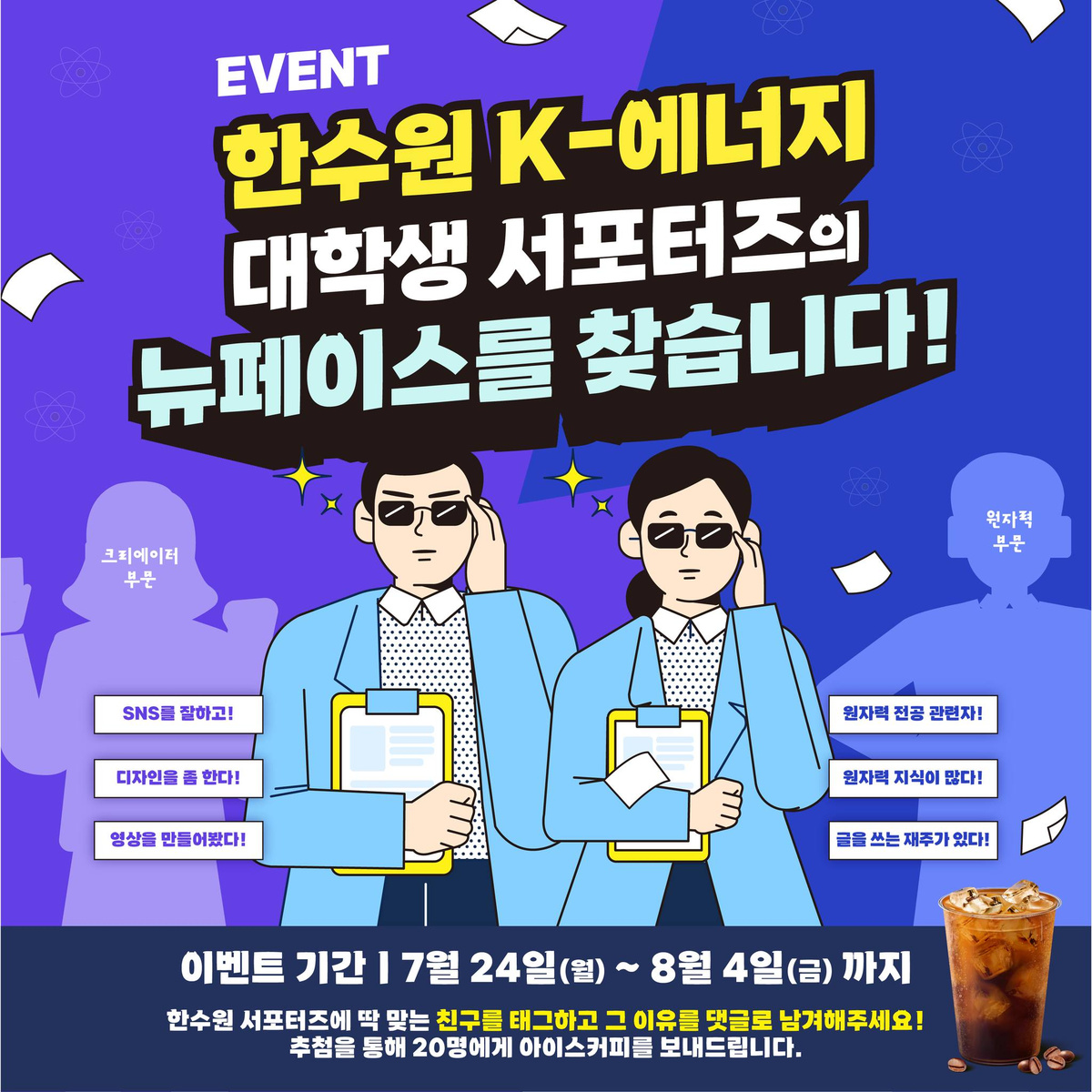 - 내 주변의 한수원 서포터즈에 딱 맞는 친구를 태그해 그 이유를 댓글로 함께 남기면 추첨을 통해 20명에게 시원한 아이스 커피 기프티콘을 보내드립니다.