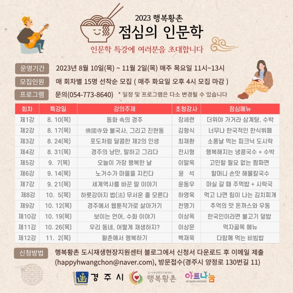 [오마이경주/경주시민신문=김경미기자] 경주시는 경주역 동편 도시재생뉴딜사업의 일환으로 ‘점심의 인문학’ 프로그램을 오는 10일 황오동 사랑채와 황촌 정지간에서 개강한다고 6일 밝혔다.