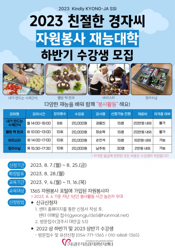[오마이경주/경주시민신문=김경미기자] (사)경주시종합자원봉사센터(이사장 정재윤)는 오는 7일(월)부터 25일(금)까지 3주 간 ‘2023 하반기 친절한 경자씨 자원봉사 재능대학’(이하 재능대학) 수강생을 모집한다고 밝혔다.