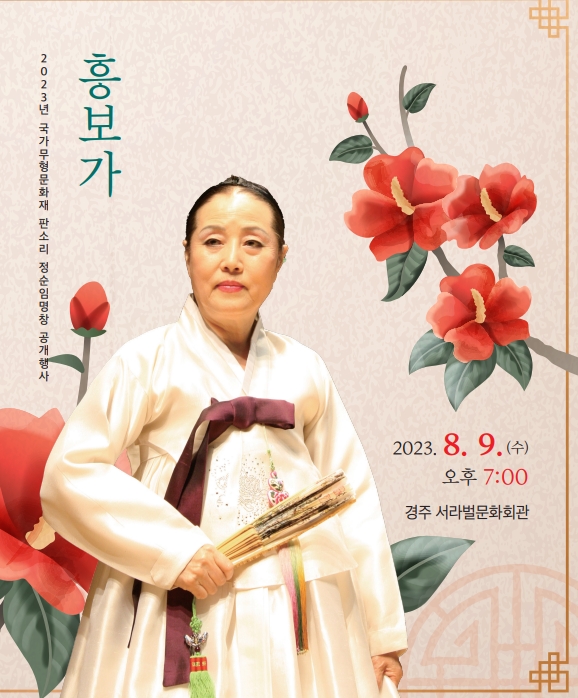 [오마이경주/경주시민신문=김경미기자] 경주에서 국가무형문화재 판소리 정순임 명창의 ‘흥보가’를 주제로 한 공개행사가 전수자들과 함께 오는 9일 오후 7시부터 경주 서라벌문화회관에서 펼쳐진다.