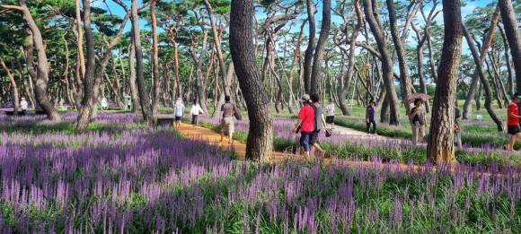 무엇보다 황성공원 산책로 소나무 군락 주위 2.2ha의 면적에 식재된 맥문동 꽃단지로 만개한 꽃을 관람하려는 관광객과 시민들로 인산인해를 이루고 있다.