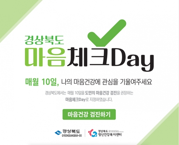 경북도는 세계 정신건강의 날(10월 10일)에 착안해 매월 10일을 마음체크DAY로 지정하고 지역민들의 마음건강검진 활성화를 도모하고 있다.