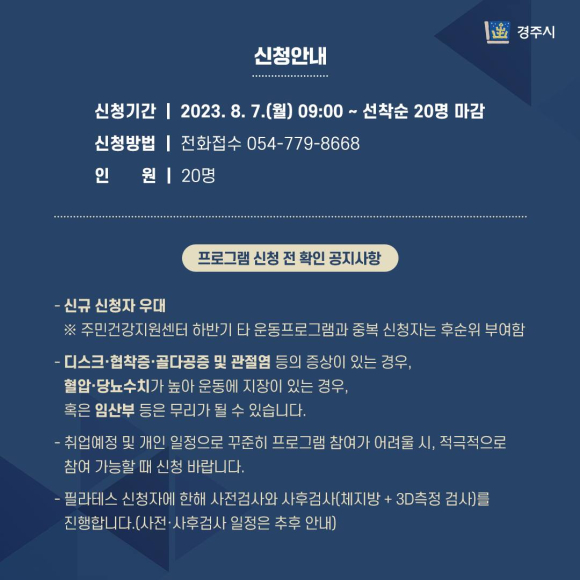 - 신청기간 : 2023. 8. 7.(월) 09:00 ~ 선착순 20명 마감- 신청방법 : 전화접수 ☎ 054-779-8668- 인원 : 20명건강한 생활을 위한 운동! *우수참여자에게 기념품 증정