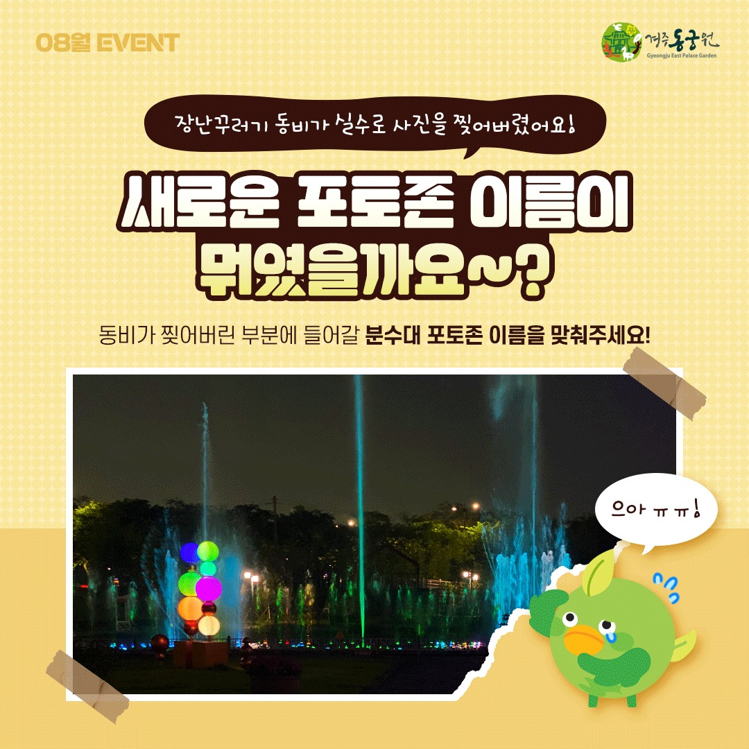 2. 장난꾸러기 동비가 찢어버린 부분에 들어갈 분수대 포토존 이름을 댓글에 적어주세요!