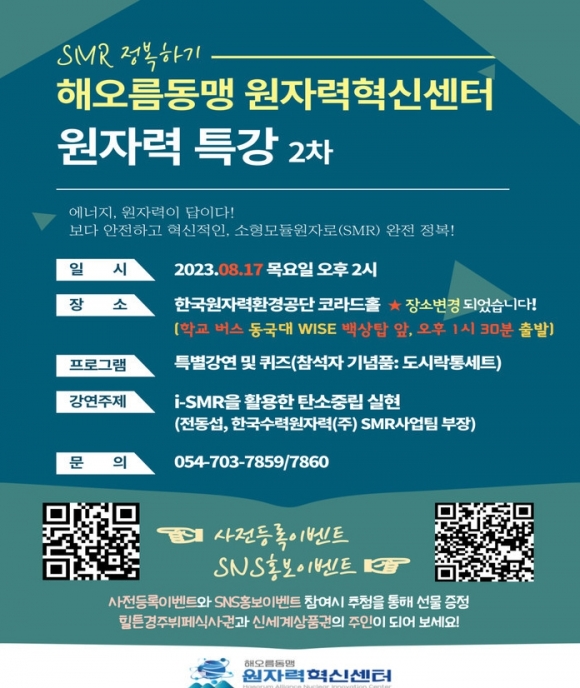 이번 특강은 전동섭 ㈜한국수력원자력(이하 한수원) 전략경영단 SMR사업팀장을 초청하여 ‘i-SMR을 활용한 탄소중립 실현’을 주제로 진행하며, 경주시민, 대학생 등 SMR에 관심있는 사람이면 누구나 참석이 가능하다.