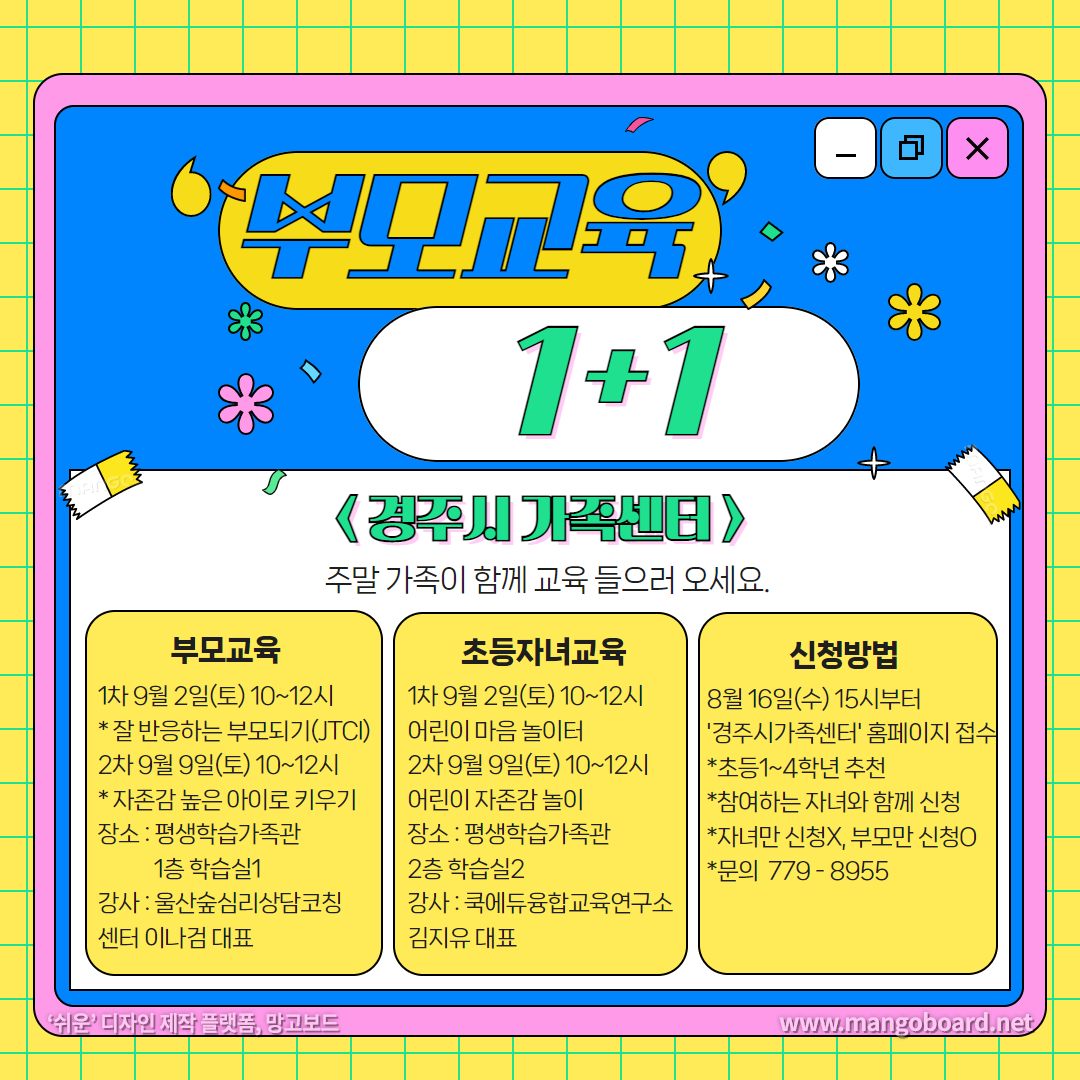 부모교육 수강시 자녀돌봄에 어려움이 있으셨던 부모님들~ 초등자녀와 함께 교육 들으러 오세요~